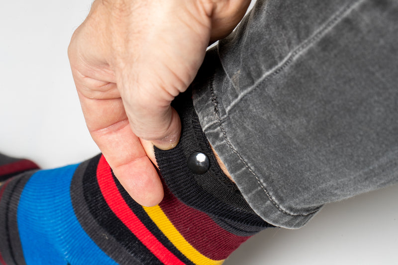 Efter brug klikker du bare sokkerne sammen med den smarte knap – så er de klar til vask.